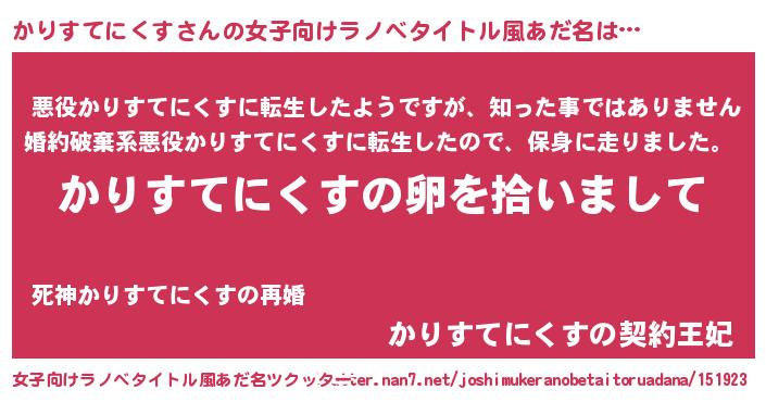 | 男性向けラノベタイトル風あだ名 | 『かりすてにくすの嫁は女の子じゃないと思った?』 |
