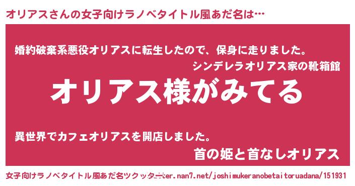 | 男性向けラノベタイトル風あだ名 | 『オリアスの嫁は女の子じゃないと思った?』 |