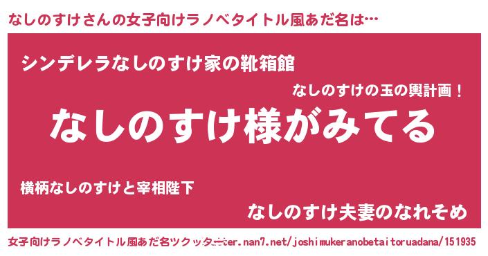 なしのすけさんの女子向けラノベタイトル風あだ名は… 『なしのすけ様がみてる』『シンデレラなしのすけ家の靴箱館』『なしのすけ夫妻のなれそめ』 ツクッター #女子向けラノベタイトル風あだ名ツクッター http://tkutter.nan7.net/joshimukeranobetaitoruadana/151935/