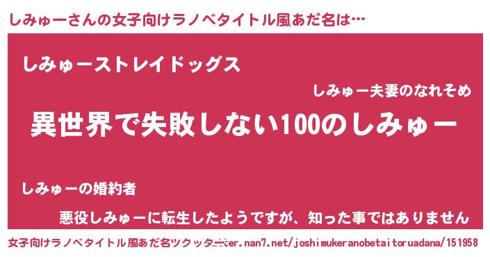 | 男性向けラノベタイトル風あだ名 | 『しみゅーという概念が存在しない退屈な世界 』 |