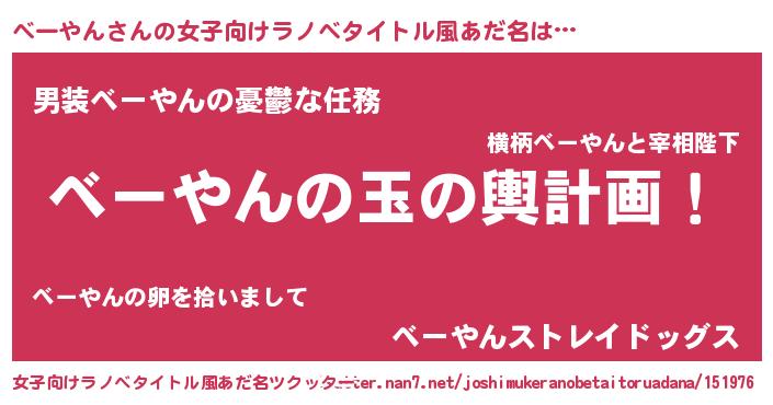 | 男性向けラノベタイトル風あだ名 | 『転生したらベーやんだった件』 |