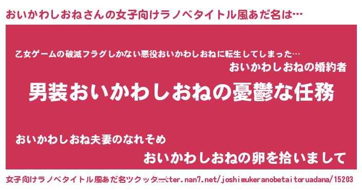 | 男性向けラノベタイトル風あだ名 | 『うちのおいかわしおねが世界を掌握している!』 |