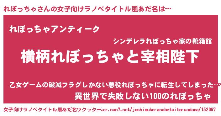 | 男性向けラノベタイトル風あだ名 | 『れぼっちゃに滅ぼされるだけの簡単なお仕事です』 |