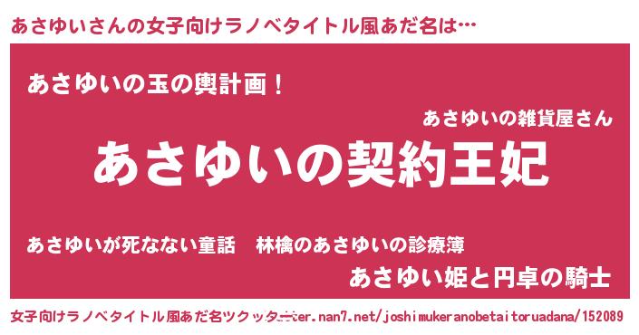 | 意味不明あだ名 | 『永久保存あさゆい』『ペロリンあさゆい』 |