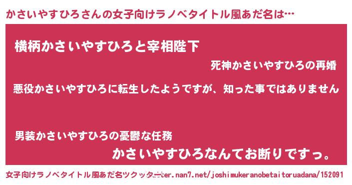 | 男性向けラノベタイトル風あだ名 | 『この素晴らしい世界にかさいやすひろを!』 |