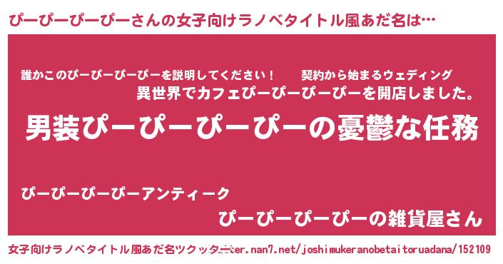 | 男性向けラノベタイトル風あだ名 | 『うちのぴーぴーぴーぴーが世界を掌握している!』 |