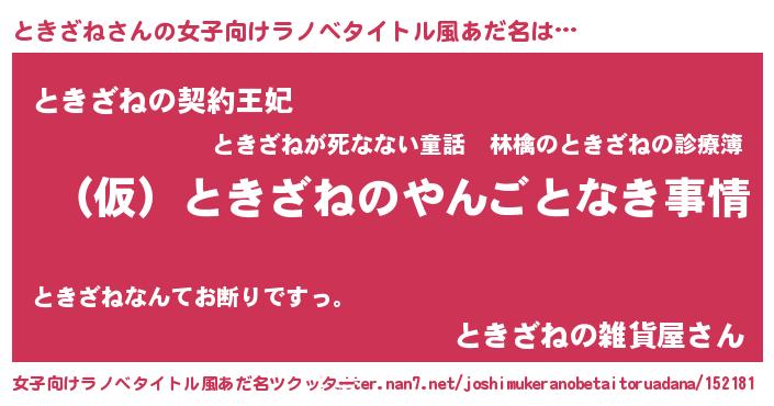 | 男性向けラノベタイトル風あだ名 | 『ときざねの憂鬱』『魔弾の王とときざね』 |