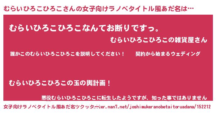 | 男性向けラノベタイトル風あだ名 | 『ムライヒロコヒロコアートオンライン』 |