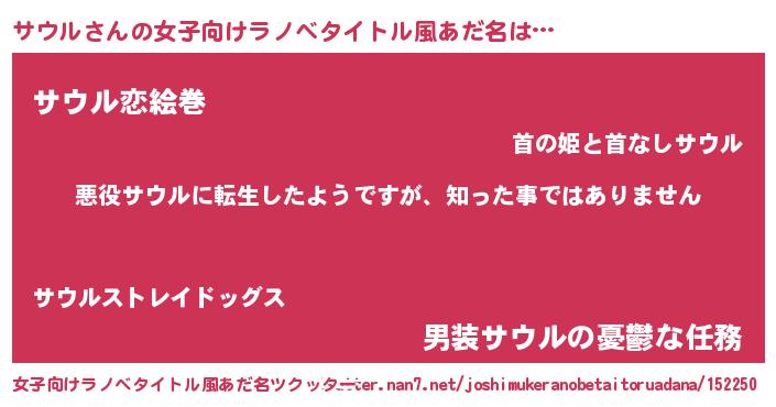 | 男性向けラノベタイトル風あだ名 | 『この素晴らしい世界にサウルを!』 |