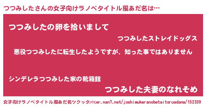 | 男性向けラノベタイトル風あだ名 | 『この素晴らしい世界につつみしたを!』 |