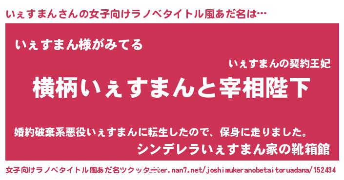 | 男性向けラノベタイトル風あだ名 | 『いぇすまんに滅ぼされるだけの簡単なお仕事です』 |