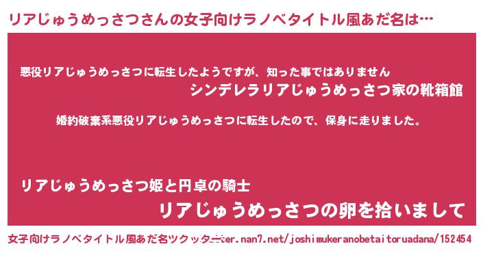 | 男性向けラノベタイトル風あだ名 | 『転生したらリアじゅうめっさつだった件』 |