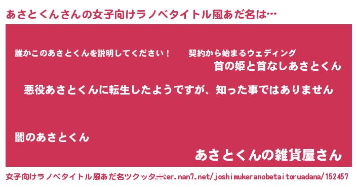 | 男性向けラノベタイトル風あだ名 | 『この素晴らしい世界にあさとくんを!』 |