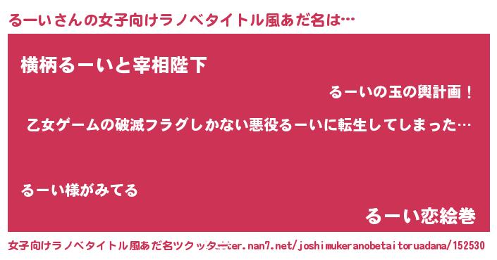 | 男性向けラノベタイトル風あだ名 | 『この素晴らしい世界にるーいを!』 |