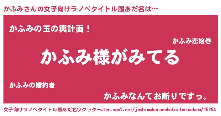 | 男性向けラノベタイトル風あだ名 | 『かふみの嫁は女の子じゃないと思った?』 |