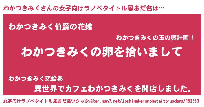 | 男性向けラノベタイトル風あだ名 | 『わかつきみくの嫁は女の子じゃないと思った?』 |