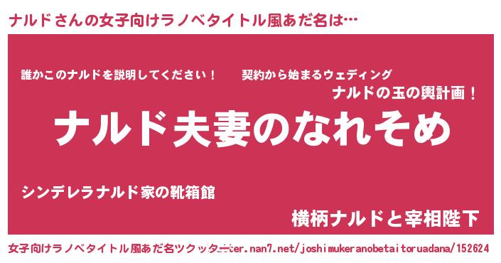 | 男性向けラノベタイトル風あだ名 | 『おまえをオタクにしてやるから、俺をナルドにしてくれ! 』 |