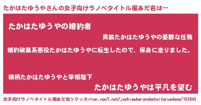 | 男性向けラノベタイトル風あだ名 | 『タカハタユウヤスレイヤー』 |