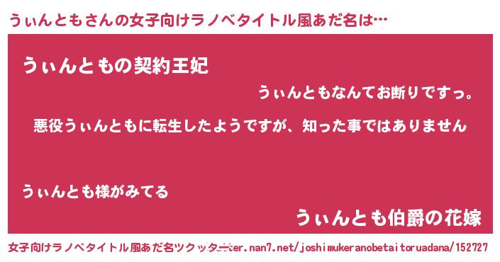 | 男性向けラノベタイトル風あだ名 | 『この素晴らしい世界にうぃんともを!』 |