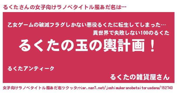 | 男性向けラノベタイトル風あだ名 | 『るくた~年齢イコール彼女いない歴の魔法使い~』 |