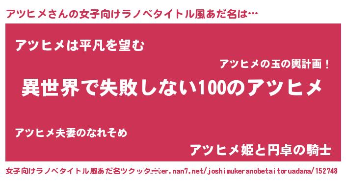 | 男性向けラノベタイトル風あだ名 | 『アツヒメという概念が存在しない退屈な世界 』 |
