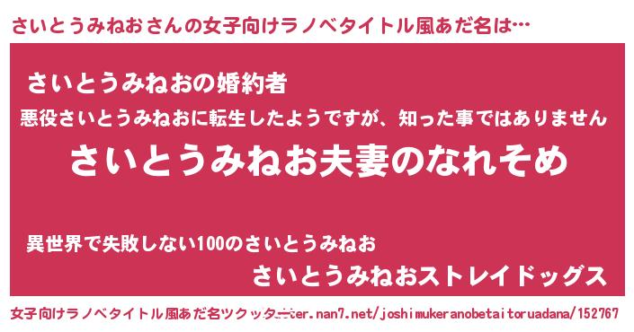 | 男性向けラノベタイトル風あだ名 | 『おまえをオタクにしてやるから、俺をさいとうみねおにしてくれ! 』 |