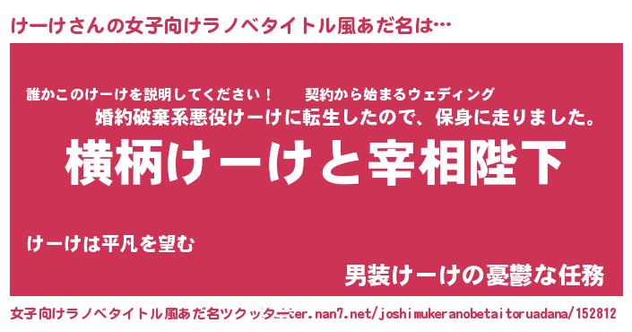 | 男性向けラノベタイトル風あだ名 | 『けーけに滅ぼされるだけの簡単なお仕事です』 |