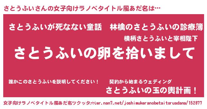 さとうふいさんの女子向けラノベタイトル風あだ名は… 『さとうふいの卵を拾いまして』『さとうふいが死なない童話 林檎のさとうふいの診療簿』『さとうふいの玉の輿計画!』 ツクッター #女子向けラノベタイトル風あだ名ツクッター http://tkutter.nan7.net/joshimukeranobetaitoruadana/152877/