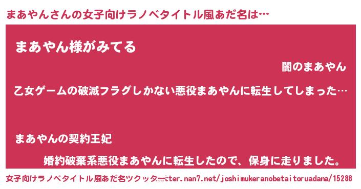 | 男性向けラノベタイトル風あだ名 | 『魔弾の王とまあやん』 |
