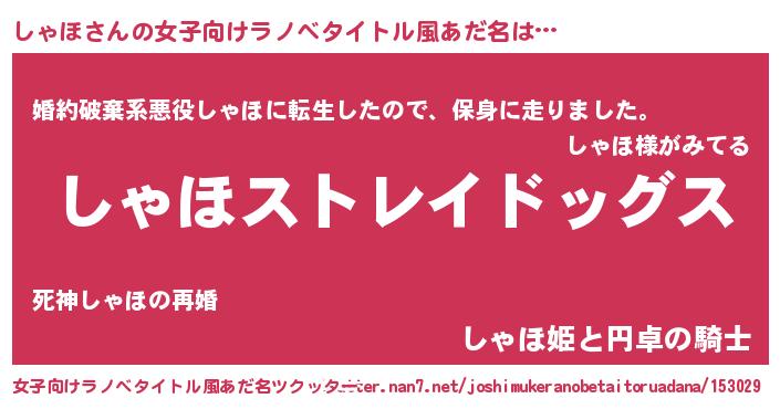 | 男性向けラノベタイトル風あだ名 | 『Re:しゃほから始める異世界生活』 |