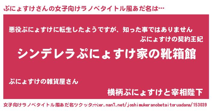 ぷにょすけさんの女子向けラノベタイトル風あだ名は… 『シンデレラぷにょすけ家の靴箱館』『悪役ぷにょすけに転生したようですが、知った事ではありません』『横柄ぷにょすけと宰相陛下』 ツクッター #女子向けラノベタイトル風あだ名ツクッター http://tkutter.nan7.net/joshimukeranobetaitoruadana/153039/