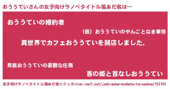 | 男性向けラノベタイトル風あだ名 | 『誰もが恐れるあのおううていが、ぼくの専属メイドになるようです。』 |