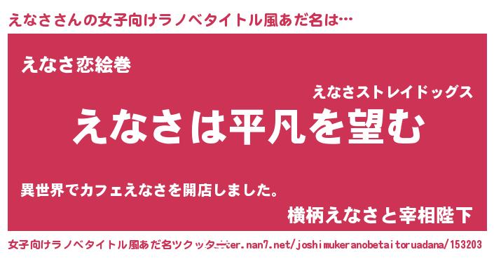 えなささんの女子向けラノベタイトル風あだ名は… 『えなさは平凡を望む』『えなさ恋絵巻』『横柄えなさと宰相陛下』 ツクッター #女子向けラノベタイトル風あだ名ツクッター http://tkutter.nan7.net/joshimukeranobetaitoruadana/153203/