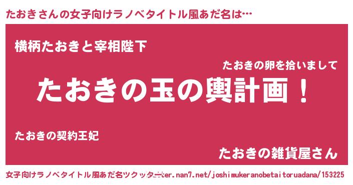 | 男性向けラノベタイトル風あだ名 | 『たおき~年齢イコール彼女いない歴の魔法使い~』 |