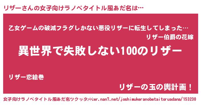 | 男性向けラノベタイトル風あだ名 | 『リザーという概念が存在しない退屈な世界 』 |
