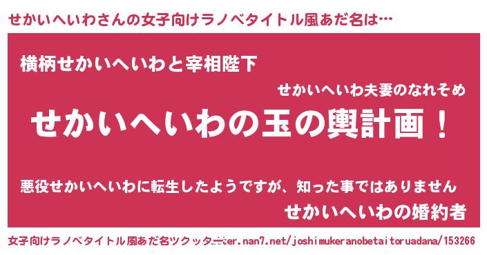| 男性向けラノベタイトル風あだ名 | 『せかいへいわ~年齢イコール彼女いない歴の魔法使い~』 |
