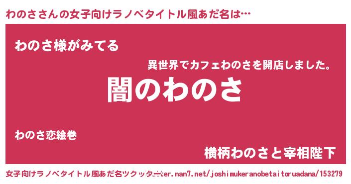 | 男性向けラノベタイトル風あだ名 | 『Re:わのさから始める異世界生活』 |