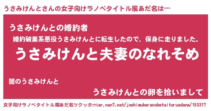 | 男性向けラノベタイトル風あだ名 | 『おまえをオタクにしてやるから、俺をうさみけんとにしてくれ! 』 |