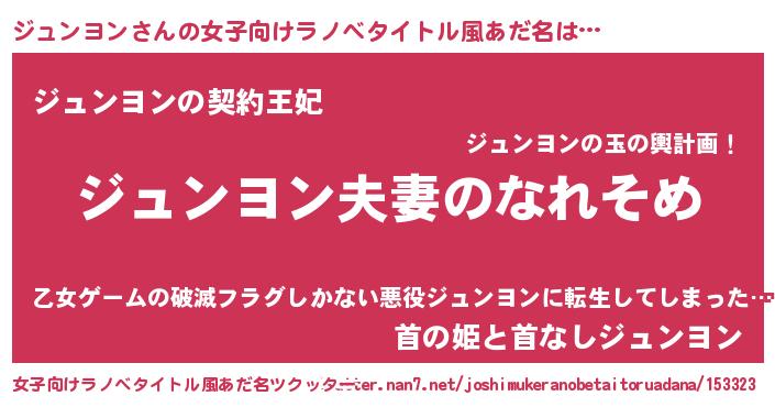 | 男性向けラノベタイトル風あだ名 | 『おまえをオタクにしてやるから、俺をジュンヨンにしてくれ! 』 |