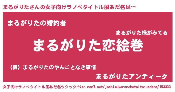 | 男性向けラノベタイトル風あだ名 | 『おまえをオタクにしてやるから、俺をまるがりたにしてくれ! 』 |