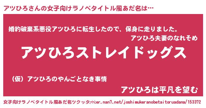 | 男性向けラノベタイトル風あだ名 | 『Re:アツひろから始める異世界生活』 |