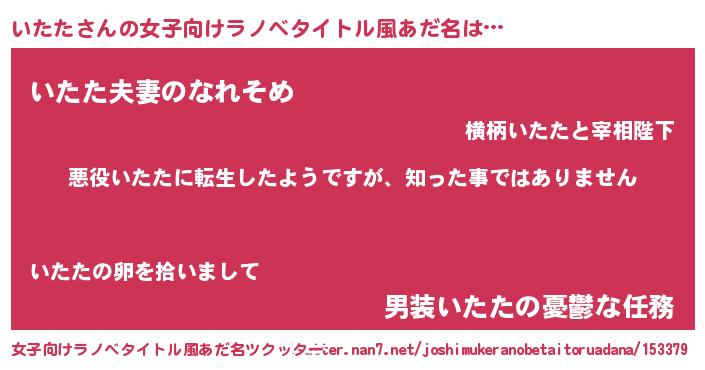 | 男性向けラノベタイトル風あだ名 | 『この素晴らしい世界にいたたを!』 |