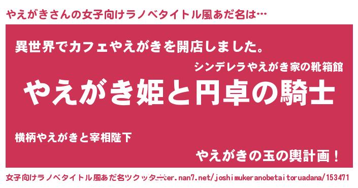 | 男性向けラノベタイトル風あだ名 | 『やえがきの憂鬱』 |