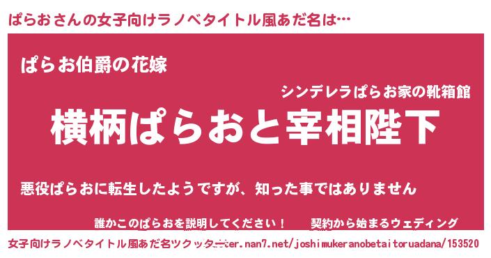 | 男性向けラノベタイトル風あだ名 | 『ぱらおに滅ぼされるだけの簡単なお仕事です』 |