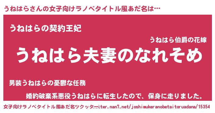 | 男性向けラノベタイトル風あだ名 | 『おまえをオタクにしてやるから、俺をうねはらにしてくれ! 』 |