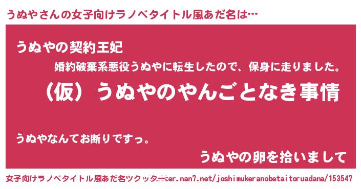 うぬやさんの女子向けラノベタイトル風あだ名は… 『(仮)うぬやのやんごとなき事情』『うぬやの契約王妃』『うぬやの卵を拾いまして』 ツクッター #女子向けラノベタイトル風あだ名ツクッター http://tkutter.nan7.net/joshimukeranobetaitoruadana/153547/