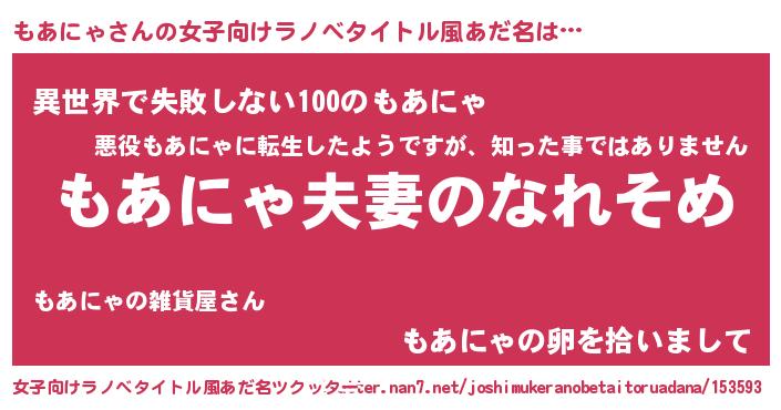 | 男性向けラノベタイトル風あだ名 | 『おまえをオタクにしてやるから、俺をもあにゃにしてくれ! 』 |