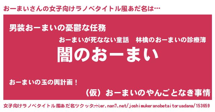 | 男性向けラノベタイトル風あだ名 | 『Re:おーまいから始める異世界生活』 |