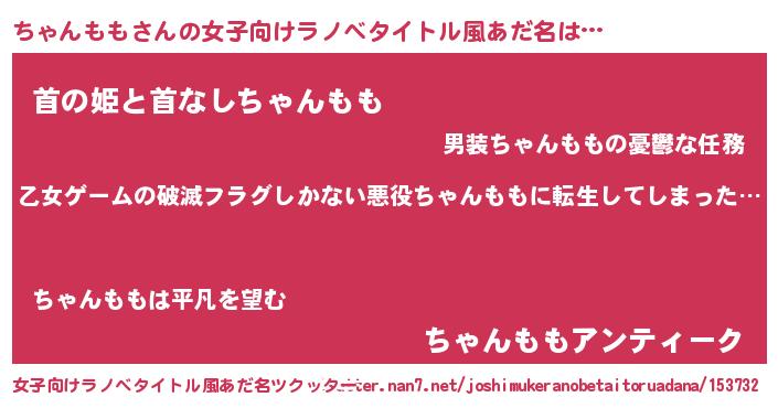 | 胡散臭い通販商品みたいなあだ名 | 『世界中を虜にした世界で10本だけ現存している希少なブランデー…その名も「ちゃんもも」』 |