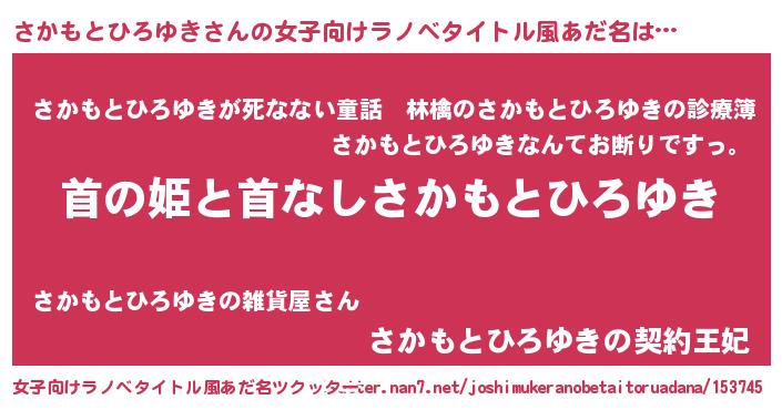 さかもとひろゆきさんの女子向けラノベタイトル風あだ名は… 『首の姫と首なしさかもとひろゆき』『さかもとひろゆきが死なない童話 林檎のさかもとひろゆきの診療簿』『さかもとひろゆきの契約王妃』 ツクッター #女子向けラノベタイトル風あだ名ツクッター http://tkutter.nan7.net/joshimukeranobetaitoruadana/153745/